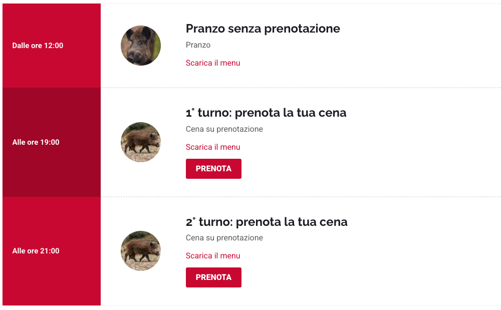 • domenica a pranzo – 1° turno alle 12.00 e 2° turno alle 13.30.
