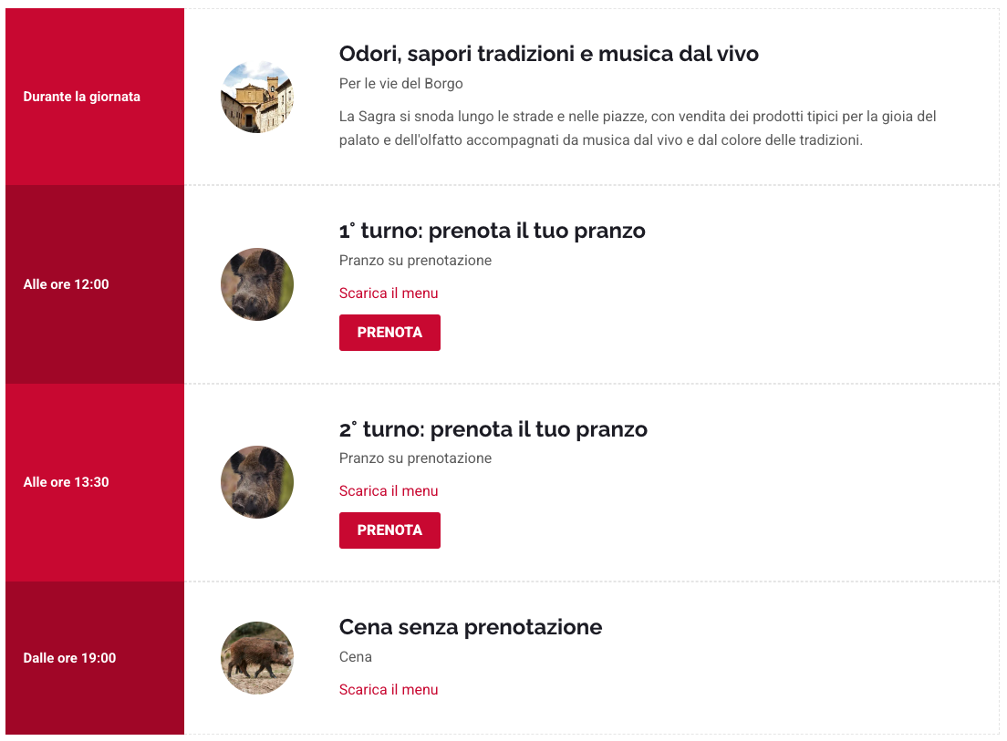 Per i turni di giovedì a cena (dalle ore 19.00), sabato a pranzo (dalle ore 12.00) e domenica a cena (dalle ore 19.00) l’accesso alla Sagra avverrà su unico turno senza la necessità di prenotare.