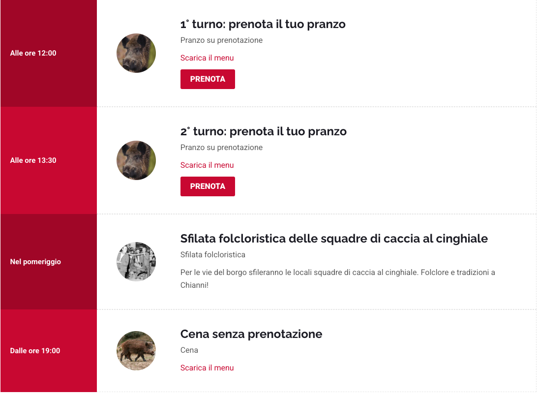 Una volta conclusa la prenotazione verrà inviata una e-mail di conferma. In caso di errori nella prenotazione o di disdette si prega di scrivere all’indirizzo e-mail sagracinghialechianni@gmail.com.